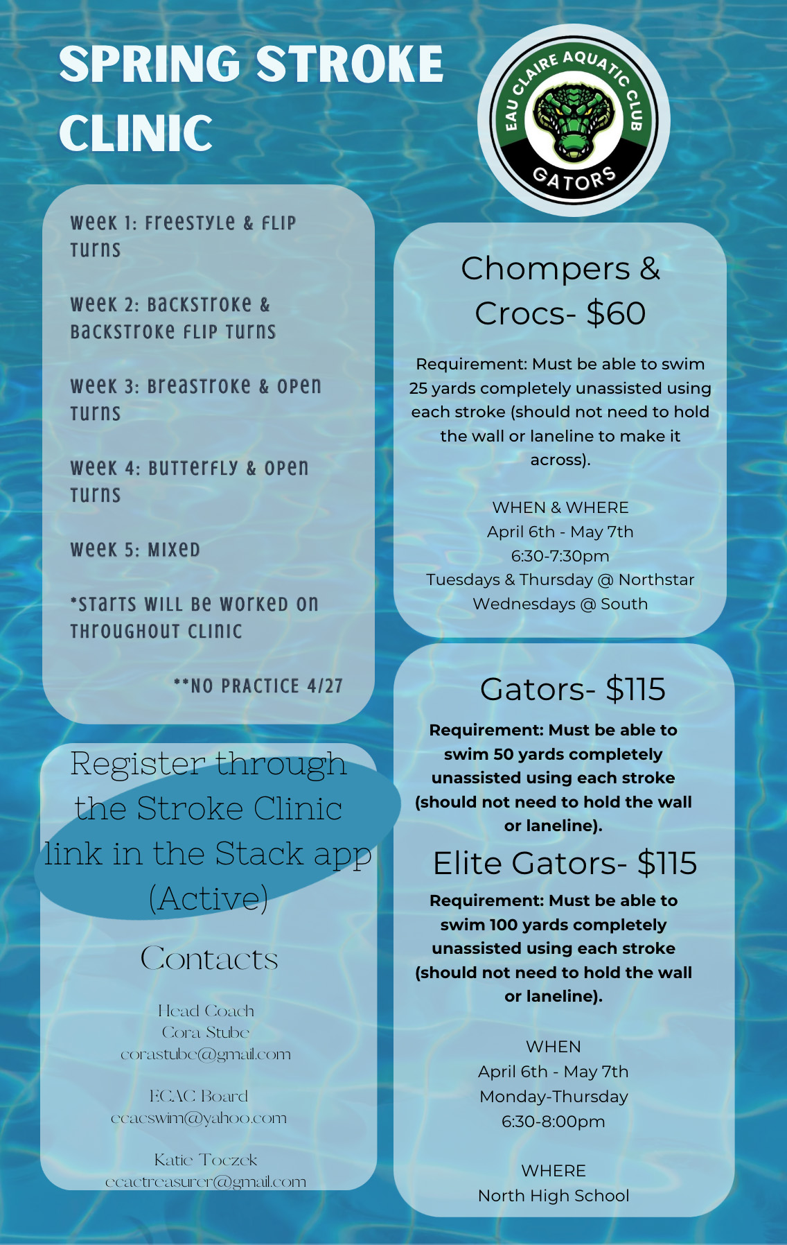 Eau Claire Aquatic Club (ECAC) is a non-profit organization open to the public. We're designed exclusively for educational, competitive and recreational purposes and are geared for children ages 5-18. We are part of the Central Wisconsin Swim Conference, West Division.